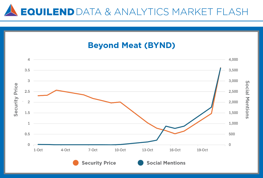 The retail investing community is at it again as Beyond Meat (BYND US) is the latest meme stock to hit the news. Shares of plant-based food company were up as much as 1,000% on October 22 following the completion of a convertible debt swap that diluted the share price as low as $0.50 on October 16. The subsequent surge was largely driven by retail investors pumping up the stock on Reddit and YouTube.