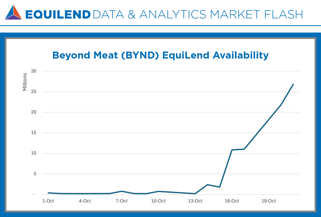 What will be interesting now is how the shorts will react. Following the completion of the convertible debt swap,EquiLend Availability has increased from less than 200,000 shares to more than 26 million. With plenty of supply in the securities finance market shorts may be betting against the recent meme pop. EquiLend’s Real-Time Data shows that an additional 1 million shares have been borrowed on October 22. Be sure to subscribe to EquiLend Data & Analytics to get real-time updates on the Retail vs Shorts BYND battle!