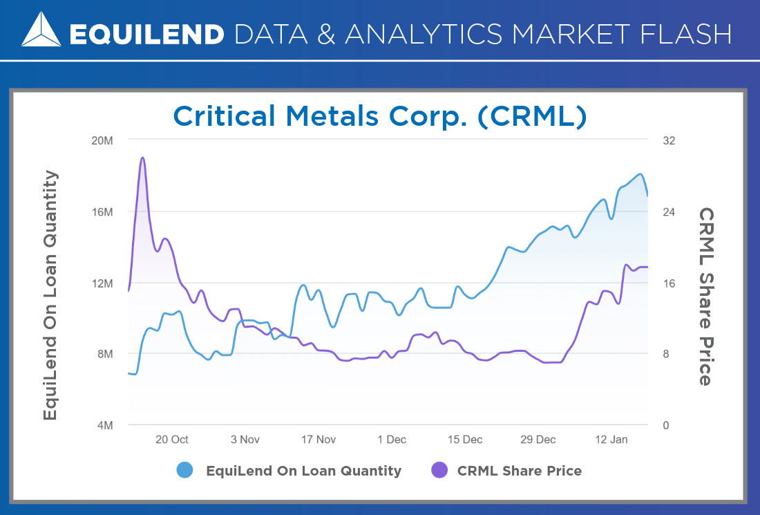 Short interest activity in Critical Metals Corp. (CRML) has intensified sharply, signaling a potential supply shock in the securities lending market. EquiLend Borrow Quantity climbed 59% month over month to a peak of 18.1 million by January 16, tightening lendable supply and pushing EquiLend Utilization from 86% to a near-maxed 99% over the same period.