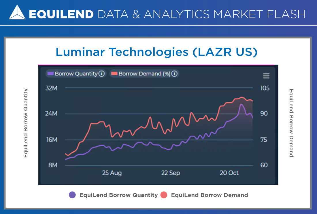 EquiLend Data & Analytics has been suggesting a potential crash for LAZR over the last several months. EquiLend Borrow Quantity has steadily risen from 9.8 million shares on August 1 to 22.7 million shares on October 30. Simultaneously, EquiLend Borrow Demand rose to nearly 100% as all available shares were borrowed, likely for shorting purposes. This dramatic rise suggests that negative sentiment has been building for some time and short sellers are now poised to benefit.