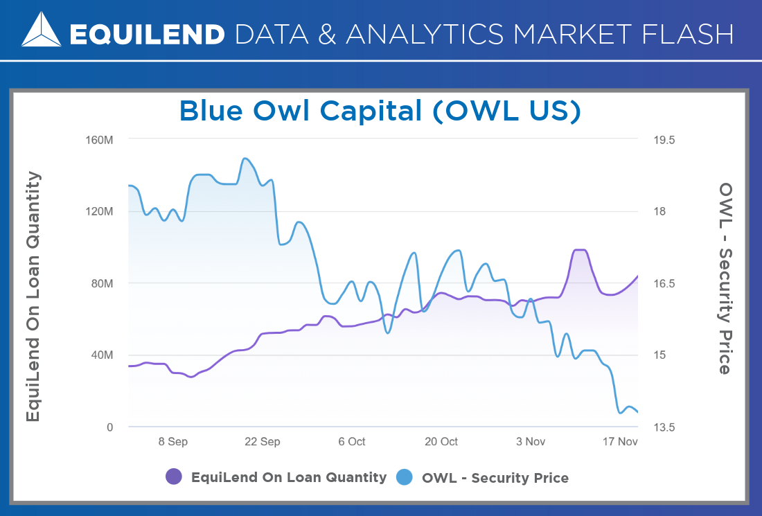 Borrow demand in Blue Owl Capital’s listed vehicles (OWL US and OBDC US) has surged in recent months, indicating an early signal of concerns around the private credit market. EquiLend’s Borrow Quantity, a leading indicator of short interest, for OWL US has jumped 150% since September, rising from 33.4 million to 83.5 million shares, while OBDC US has climbed to 16.4 million shares from 10.2 million over the same period. EquiLend’s real-time securities lending data suggests investors are positioning for further declines in OWL US beyond its 25% slide since September.